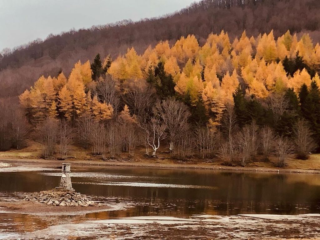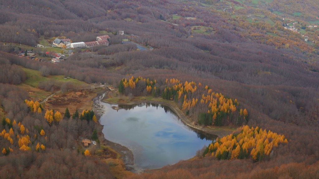 L’ampia strada sterrata, sale morbida nella faggeta che dopo aver lacrimato tutte le foglie ed essersi denudata praticamente per intero, ora gocciola i residui dell’ultimo scroscio di pioggia, ticchettando sul tappeto rosso fuoco nel quale si cammina per una decina di minuti, fino al suggestivo Lago Calamone, che (forse a causa di lavori di manutenzione?), è per gran parte a secco, come non l’ho mai visto in tanti anni. Qui qualche conifera regala ancora colori in verticale e soprattutto ogni passo una miriade di ricordi ed emozioni nelle tante escurisioni del passato. Questa era la parte che mi più mi teneva in ambasce e non a torto. Il piccolo tempietto in sasso normalemte immerso nelle placide onde della zona nord del laghetto, è ora completamente emerso e dietro lo specchio d’acqua langue torbido e appena mosso da una leggera brezza che scende dalla boscaglia che di lì a poco inizia ad inerpicarsi sulle pendici del monte.. Anche il rifugio posto sulla sponda destra è chiuso. Qualcuno lavora per liberare e quindi salvaguardare materiali e forniture dalle intemperie, che a breve investiranno gelide anche i tavoloni di legno, ora silenziosi e sui quali chissà quanti hanno goduto della frescura o della pace nei mesi estivi ed autunnali che ora volgono all’inverno. Impossibile non correre con la memoria a birre Moretti e felicità che io per primo su quei tavoli ho avuto la fortuna di poter sorbire a piena anima e cuore.