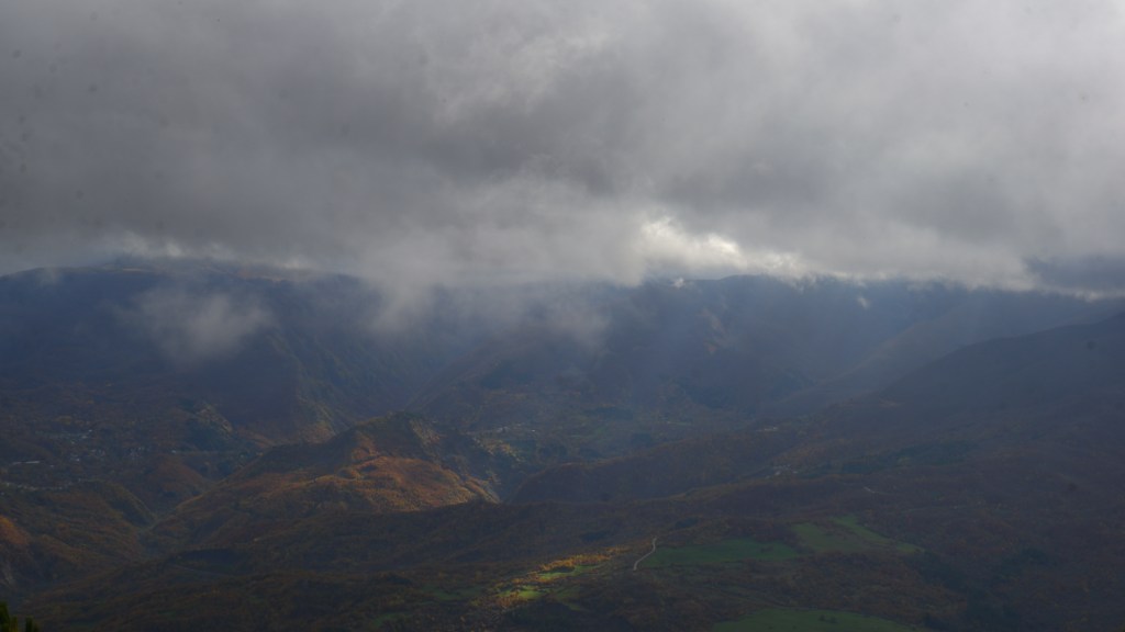 Di lì a poco altro bivio, dopo una salitina su fondo sassoso, scavato dal’acqua e dai milioni di passi che questo sentiero ha conosciuto, così come la mia memoria è sagomata dai ricordi che mi fanno salire quest’oggi quasi in uno stato di assenza sul presente. Potrei andare ad occhi chiusi, tanto le immagini ed i suoni che vedo e sento sono più quelli che scaturiscono dalla memoria, che non quelli che sto vivendo in quel momento. Mi estraneo in una specie di trans maliconica che procede nel taglio a destra nella oggi ingiallita prateria che porta senza particolari strappi alla svolta a 180° verso il tratto finale dell’erta. Qui dove di fatto si cambia direzione tornando da sud a dirigersi verso nord, c’è un’altra meravigliosa terrazza. Raggi di sole squarciano il grigiore che attanaglia l’oggi invisibile Cusna e si proiettano sulla valle del Secchia che scende sinuosa. Anche qui qualche foto e le parole del passato che sembrano essere imprigionate nei rami degli ultimi faggi e delle ultime conifere, che si possono incontrare da qui alla Croce in vetta. Il meraviglioso costone a precipizio e là sotto Cervarezza, dietro il Cisa e il Prampa, la cui vista riporta ad altre contrastanti emozioni, come se qui non si rischiasse l’overdose.