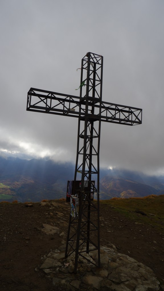 Si sale nell’erba gialla e nel vento che ora è gelido e mi fa venire voglia di rimettere la giacca tolta alla prima stilla di sudore nella faggeta iniziale. Le mani stringono forte i bastoncini, gli occhi l’orizzonte in salita e il cuore le emozioni che sfociano in commozione inevitabile, mentre qualche altro escursionista mi segue e si staglia come spettro dietro me, in un gioco di prospettiva che questo tratto di sentiero rende unico. Altri viandanti salutano; qualcuno fa una battuta, ma io sono immerso nei miei pensieri e non voglio che nessuno mi distragga. Li tengo stretti e consapevole dell’impossibilità della cosa, prima ancora di riuscire a darmi del cretino, penso che la cosa che vorrei più di tutte sarebbe catapultarmi indietro nel tempo e guarire all’istante da questo male nostalgico che mi affatica più della salita ora intensa. Voglio stare solo con la mia malinconia e con il mio senso di abbandono, non mi va di mettere la testa sotto la sabbia e imbambolarmi di falsa felicità, anche se il monte mi vuole bene anche se l’ho trascurato e mi sta aiutando a salire. Ci sarà tempo di lì a poco per rientrare nel mondo. In questo stato arrivo alla croce posta sulla vetta.