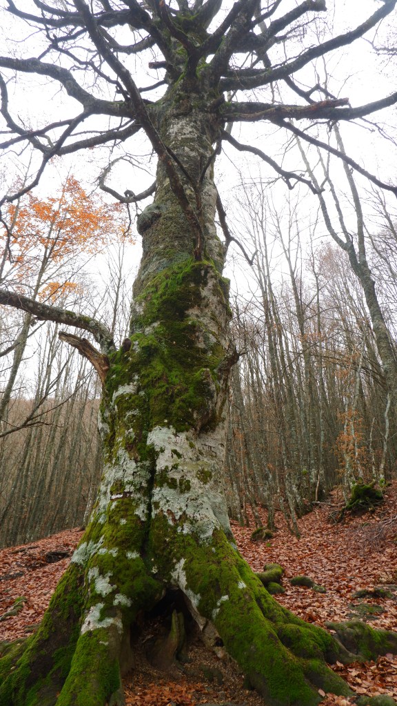 Dietro il rifugio inizia a salire il sentiero CAI 611 (per ora coincidente con il 667). Qui alcuni piccoli ponticelli in legno fanno superare gorgoglianti rii che scendono vivaci per tuffarsi nel lago che in men che non si dica è alle spalle. Il fondo, come sempre in questa stagione, è qui molto bagnato. Ricordi di salite invernali, senza neve, ma con questo tratto gelato al mattino e solitamente fangoso alla discesa. Qui non c’è ancora ghiaccio, ma si scivola facilemente nel misto fra foglie umide e argilla infida. Forse questo è il tratto più duro dell’intera ascesa, con una pendenza che in alcuni tratti si fa severa. Enormi faggi dalle spettacolari braccia ormai nude, abbracciano la vista e riportano l’eco dello stupore che ogni volta che m’imbatto in loro suscitano in me per la loro magnificenza ed imponenza. Giusto un quarto d’ora e dopo l’uscita dal bosco i sentieri si separano: a destra, verso Pratizzano va il 667, a sinistra, verso la vetta il 661. Un piccolo spiazzo offre il primo scorcio di panorama che qui si affaccia sull’imponenza dell’Alpe di Succiso. Foto che ho già fatto decine di volte e che anche proprio nel recente sono andato a riguardarmi con nostalgia e inevitabile tristezza per quello che da uno scatto all’altro, purtroppo si è perso: il click scatta in automatico, per arricchire la collezione, anche se con un’istantanea purtroppo questa volta ottenebrata dalle nuvole che coprono o comunque limitano il panorama e soprattutto decisamente vuota rispetto a quelle a cui sono più affezionato del passato.