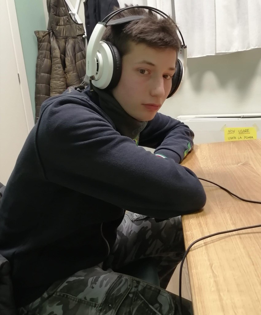 Fabio non ha molta voglia di raccontare delle amicizie a scuola e delle sue giornate scolastiche, anche se dice che gli piace andare a scuola, ma cambia decisamente tono quando ci parla di Teatro e dello spettacolo a cui partecipa come attore in Anffas e del basket. Gli piace anche la musica, ma come al solito noi vecchiacci non conosciamo gli artisti citati dai ragazzi e quindi un po’ per colpa nostra l’argomento decade forse un po’ velocemente.