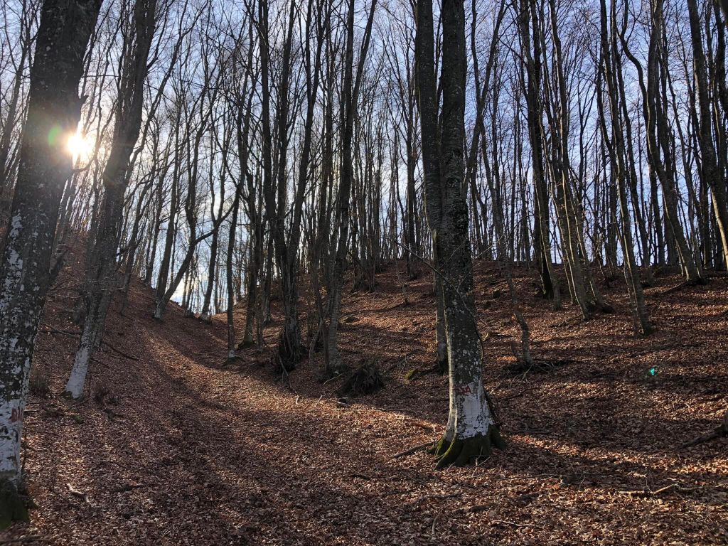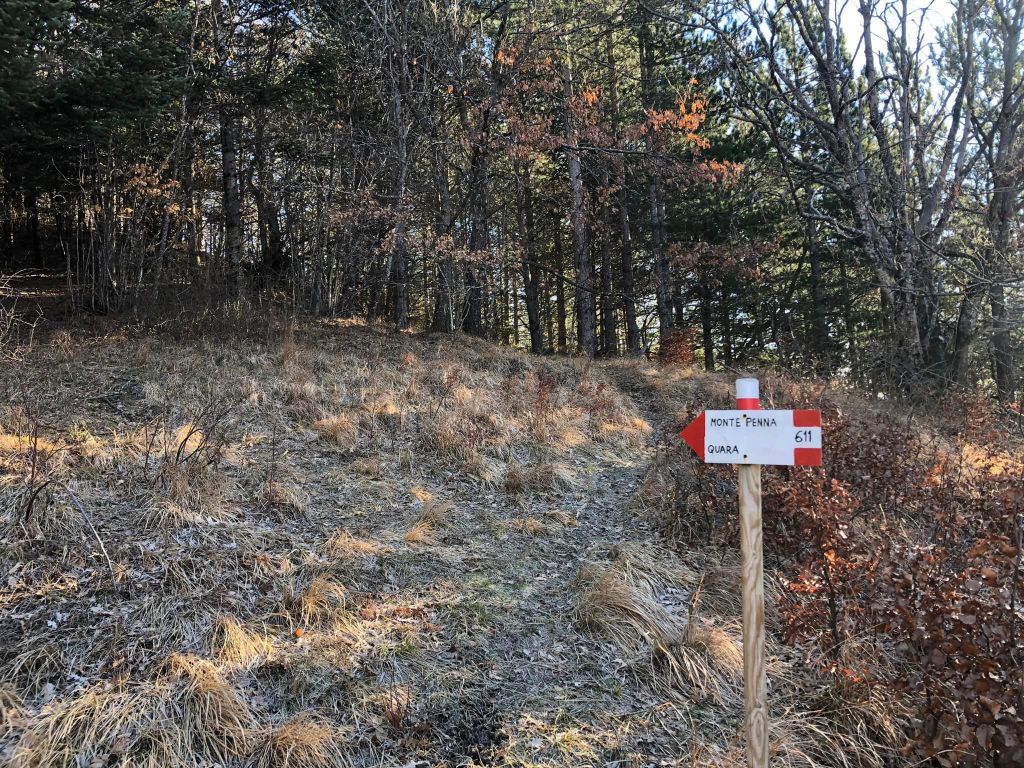 Preseguendo lungo la faggeta si fanno alcuni sali scendi e da qui, purtroppo, i segnali non sono molto chiari. Probabilmente mi distraggo un po’ pensando ai fatti miei, così liscio una svolta a sinistra e continuo seguendo e fidandomi della traccia calpestata che mi porta nella fitta vegetazione prima, su una costa che dirige verso est poi…sto andando dalla parte opposta mi dico e me ne convinco proprio quando gli alberi mi lasciano lo spazio sufficiente per vedere sulla mia sinistra l’inconfondibile sprone del Penna, che continuando per questa via mi lascerei alle spalle. Dopo aver camminato pochi minuti in direzione sbagliata, confuso anche da alcuni vecchi segnali CAI, probabilmente di un sentiero non più in uso, faccio dunque dietrofront e ad un certo punto, eccola la svolta truffaldina, con il sentiero che salendo mi avrebbe costretto alla deviazione a sinistra. Ora ovviamente devo girare a destra, arrivando da direzione opposta e lo faccio con rinnovato entusiasmo: il timore era quello di aver perso troppo tempo e di non aver più la possibilità di arrivare alla meta prefissa, ma per fortuna le cose non stanno così, visto che la deviazione non mi è costata più di 15/20 minuti in più fra andare e tornare.