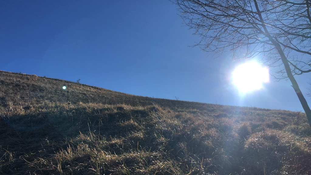 La discesa è agile e veloce. Anche in senso inverso le roccette non creano particolari problemi (forse possono diventare un po’ più antipatiche in caso di fondo bagnato, sicuramente lo sono con il fondo ghiacciato). La mattinata calda e il sole alto allietano la mia camminata. Dove mi ero sbagliato all’andata, cincischio nuovamente e rischio ancora di perdere la retta via: sarò un po’ stordito, ma a quanto pare in questo punto qualche segnale più preciso potrebbe essere necessario. Quando torno nei prati che stanno per riportarmi a fine giro, mi concedo un po’ di leggerezza e mi viene quasi voglia di sdraiarmi a godere del sole e della pace che regna incontrastata. Un’antenna e dei ripetitori che avevo notato di sfuggita all’andata, mi avvisano che siamo vicinissimi alla civiltà, di nuovo. Ecco il guaito del cane della fattoria a darmi il benvenuto, vedendomi scendere dall’alto. Il rumore di un motore, poi quello di una motosega. Due persone (padre e figlio, probabilmente), silenziosamente lanciano tronchi di legna tagliati, in una benna collegata ad un robusto trattore. Non mi guardano nemmeno e a testa bassa continuano a fare il loro lavoro. Io mi faccio qualche viaggio mentale su di loro: la fantasia che galoppa quando si è soli…il bello di camminare da soli, penso, per poi capire che qualcuno manca a camminare con me e che le belle compagnie, soprattutto in montagna sono cosa rara, ma per me a volte presenti. Ecco questo giro mi piacerebbe molto farlo con la compagnia giusta, penso immediatamente.