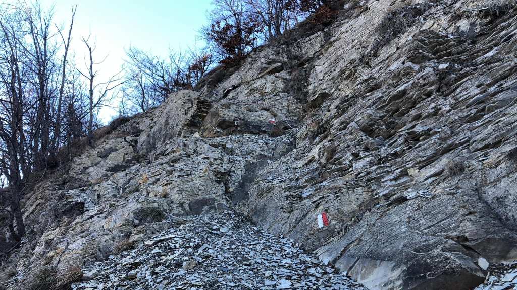 Poco dopo la svolta eccomi uscire dal bosco e ritrovarmi alla nuda, su terreno brullo e ghiaioso. Roccia arenaria sbriciolata che scricchiola sotto i piedi proprio come il l’erba ghiacciata poco prima ed eccolo, in bella vista, di nuovo il massiccio del Cusna che svetta sulla mia sinistra. Da qui è possibile vedere tutte le borgate ai piedi del gigante: Case Balocchi e Castiglione qui sotto, più in là Riparotonda, Febbio, Roncopianigi e più in alto di tutti Monteorsaro, con quella ormai caratteristica casetta pitturata di rosso nel fitto caseggiato grigio, che spicca da lontanissimo e fa da certo punto di riferimento. Il sole scalda questa mattinata invernale in modo oserei dire innaturale e per quanto la salita non sia particolarmente impegnativa, a causa del surriscaldamento solare la fronte mi s’imperla di sudore. In realtà basta pochissimo perché si raffreddi, giusto alcuni minuti, quando rientrando nella faggeta si torna nel cono d’ombra dello strapiombo roccioso della vetta che ora è sulla mia testa, ma che il sentiero inizia ad aggirare sul lato ovest, quindi sul versante che cade a picco verso il tumultuoso e neonato Secchiello. Il torrente scorre a diverse centinaia di metri sotto di noi, intuibile solo dalla profoda ferita che lascia a fianco della Statale per Villa Minozzo nella vegetazione.