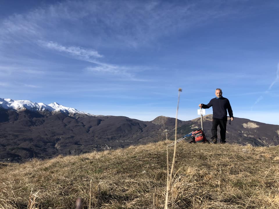 La giornata è bella, ma non è perfettamente limpida, quindi l’orizzonte si spegne nella foschia, altrimenti, dicono, da qui nelle giornate completamente terse si potrebbe vedere l’arco alpino. Io mi so accontentare e mi godo la pace e il silenzio di questa piccola vetta, che offre però uno dei panorami più belli della zona. Suggestiva e senza troppe difficoltà, eccola dunque l’erbosa piana su cui ero stato tanti anni fa e come ricordavo da allora, valeva veramente la pena tornarci. Sono solo e solo a camminata finita mi viene da pensare al fatto che non ho incontrato anima viva in tutto il tragitto: sentiero poco battuto a quanto pare. Mi faccio aiutare da un arbusto per un selfie con segnavia. Ancora qualche foto e soprattuttolo sguardo perso nell’orizzonte, nel tentativo di incamerare quani più dettagli possibile di tutta quella meraviglia e per godere il più possibile della sensazione di vastità che si ha da qui. Mi allargo in un abbraccio, dentro il quale però non risco a farci stare tutto quel ben di dio. Se non fosse stato per l’errore e la conseguente deviazione forzata, la percorrenza sarebbe stata di non più di un’ora da Pian del Monte, dove torno ripercorrendo la stessa via della salita, in una cinquantina di minuti.