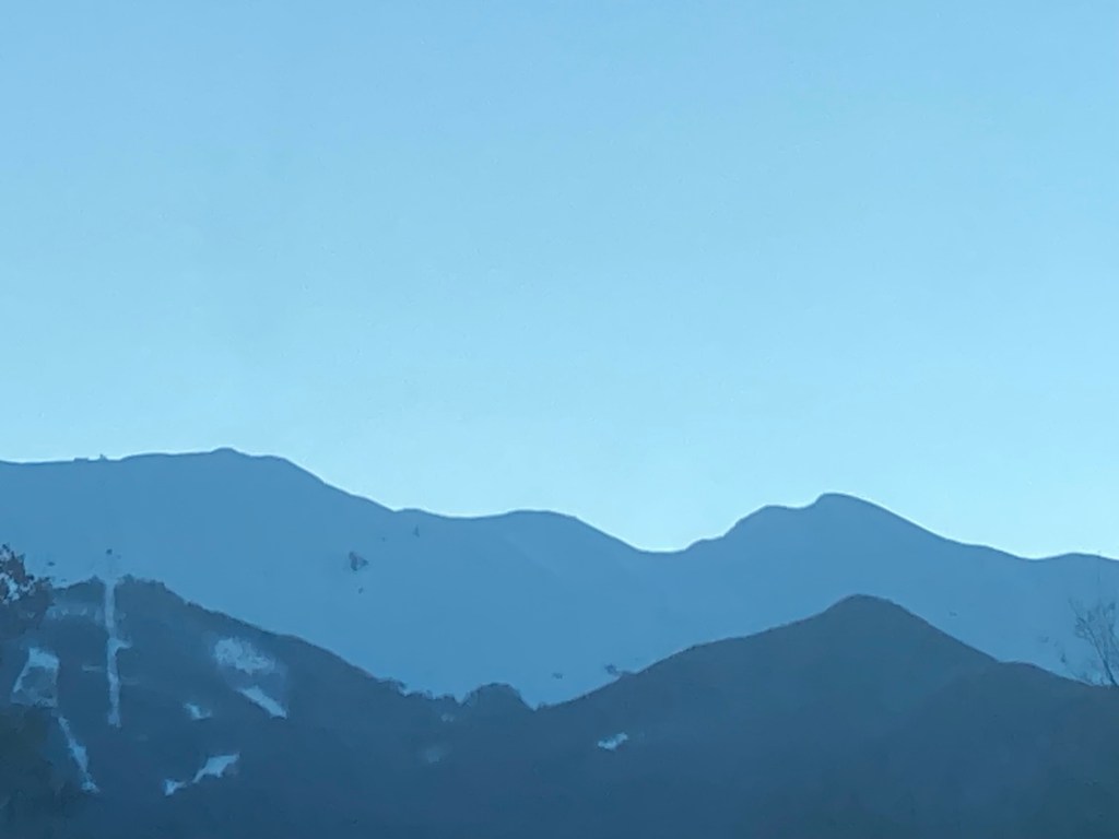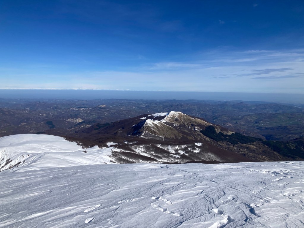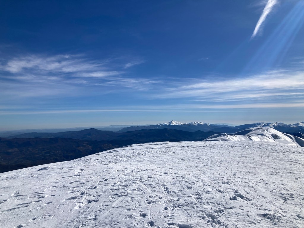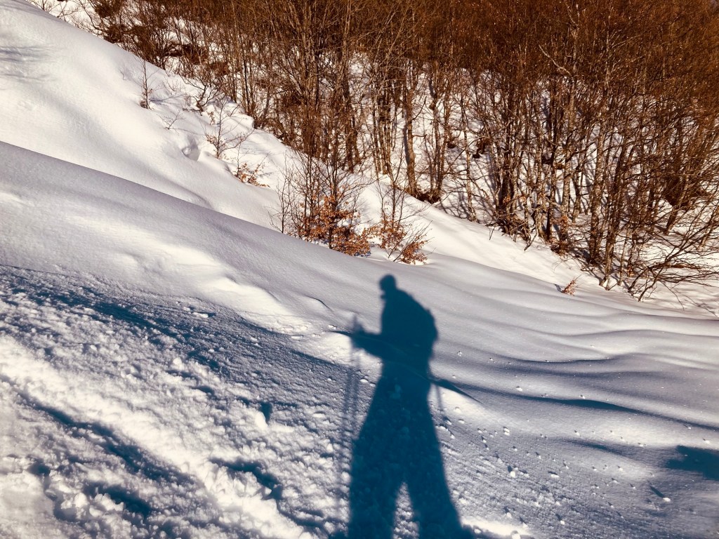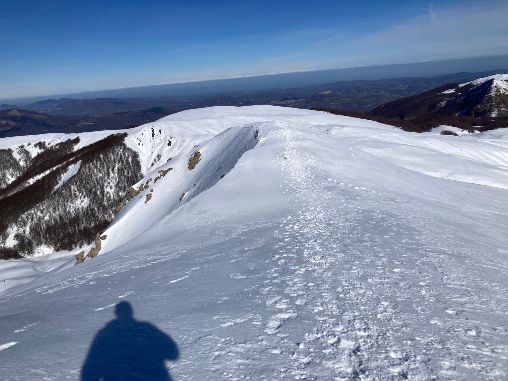 Questa è davvero dura e nella luce azzurrina, non mi resta che concentrarmi su ogni singolo passo. Non c’è pericolo, solo fatica, ma anche quella può portare a sbagliare qualcosa e in queste situazioni il margine c’è ma non è infinito. La picozza qui si pianta più in profondita, fra sbuffi di neve polverizzata che salgono nell’aria che ora si sta anche facendo più freschina. La via è segnata dal passo di chi ho davanti e di chi l’ha già percorsa prima di noi. Quando arrivo in cima a questa ripida salita, il crinalino sottile fa un ricciolo a sinistra, dove la discesa si tuffa in un canalone profondo e immacolato, che ora sta brillando al sole che seppur velato, ora torna a scaldare la pelle scoperta. Sulla destra inizano ad essere visibili le montagne che portano verso il confine con la Toscana e la Liguria, oltre alla valle dell’Ozola, ferita che spacca in due il panorama. Di fronte vedo l’escursionista prima citato che si ferma a parlare con due che invece stanno scendendo. Li supero salutando per non perdere il passo che ormai ho ritmato e che riesco a sostenere, non senza fatica, ma senza criticità. Ancora una questione di equilibrio. Sono quasi stupito di me stesso, poi alzo gli occhi fino a quel punto piantati sul passo successivo e vedo allargarsi il fronte. Manca il nasone del gigante da affrontare e a differenza dell’estate, lo si può fare dritto per dritto, perché i vari canaloni sono pareggiati dalla spessissma coltre nevosa. Conoscendo bene questa via posso ipotizzare che ci siano almeno 2 metri di neve, portati dal cielo, dal vento e conservati dalla tenacia del freddo notturno. Il fondo ora cede leggermente. Mi fermo a rifiatare, prima di rimettermi a testa bassa a guardare l’orizzonte in cui l’azzurrognolo della neve, va a staccare con quello più intenso del cielo, ora striato da sfilacciate nuvole che continuano a mitigare la forza del sole.