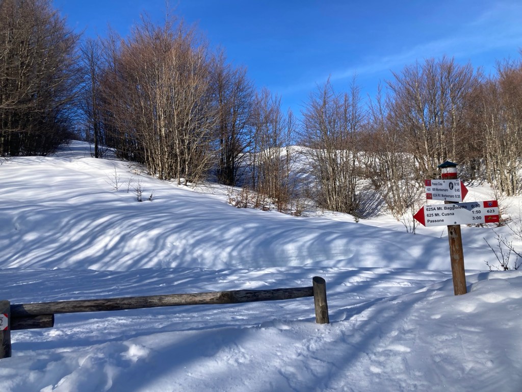 Le rampette che portano prima all’altezza del Passo Cisa, poi nell’ultimo tratto di forestale prima di arrivare ai piedi del Bagioletto, come al solito mi fanno pagare dazio. Le staccionate poste a delimitare la via sono praticamente sommerse e spuntano solo con la parte più alta. Anche i segnavia sono immersi per tre quarti buoni. Il sole inizia a scaldare, ma la neve tiene ancora abbastanza bene, soprattutto nei punti in cui gli innumerevoli passaggi l’hanno compattata. Si sale agevolmente senza scivolare e senza affondare.