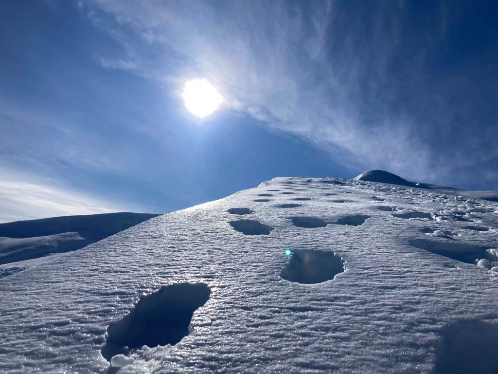 L’ultima volta mi ero fermato qua, scoraggiato dalle previsioni negative, confermate in diretta da un cielo ostile e nuvole basse che mi avevano suggerito di non andare oltre. Oggi la giornata è davvero promettente e nonostante la fatica per la salita fatta fin lì, le gambe stanno molto bene. La neve è davvero tanta e non lascia spazio ad altri colori che il bianco, che cozza nell’azzurro brillante del cielo, solo a tratti velato da nuvole innocue. Un altro escursionista è fermo di fianco ai segnavia che aprono la strada sulla salita che da lì a poco attacca in direzione delle Prese. Si sta mettendo i ramponi con una certa difficoltà. Anche qui io decido di andare oltre senza, perché il fondo sostiene e non è per niente scivoloso, grazie ad un piccolo strato di neve non ghiacciata, ma compatta: grip ancora perfetto, via larga e pendenza limitata. Guardo avanti e vedo dei puntini che salgono piano sulle creste sottili, unica via possibile quando la neve pareggia ogni altra, rendendola inaccessibile. Non sono solo, ma non ho nessuno così vicino da distrarre dai miei pensieri e dal mio stupore per la bellezza indescrivibile che mi circonda. Penso che qui sotto è pieno di gienpri e che in primavera il prato si riempie dei colori sgargianti dei fiorellini gialli, viola e azzurro elettrico che amo tanto. Ora l’unico contrasto col bianco rimangono quei puntini scuri lontani e l’azzurro del cielo.