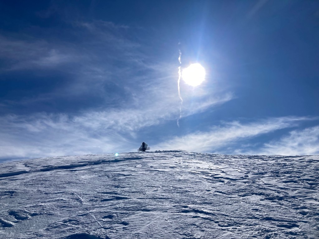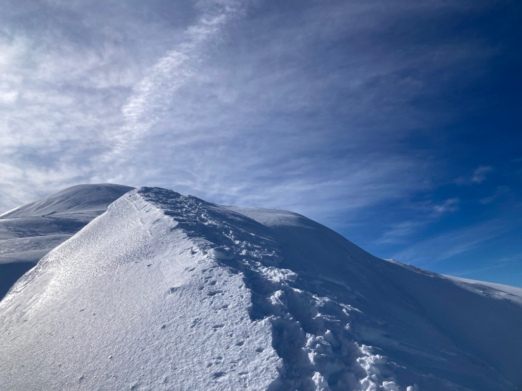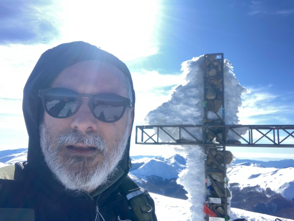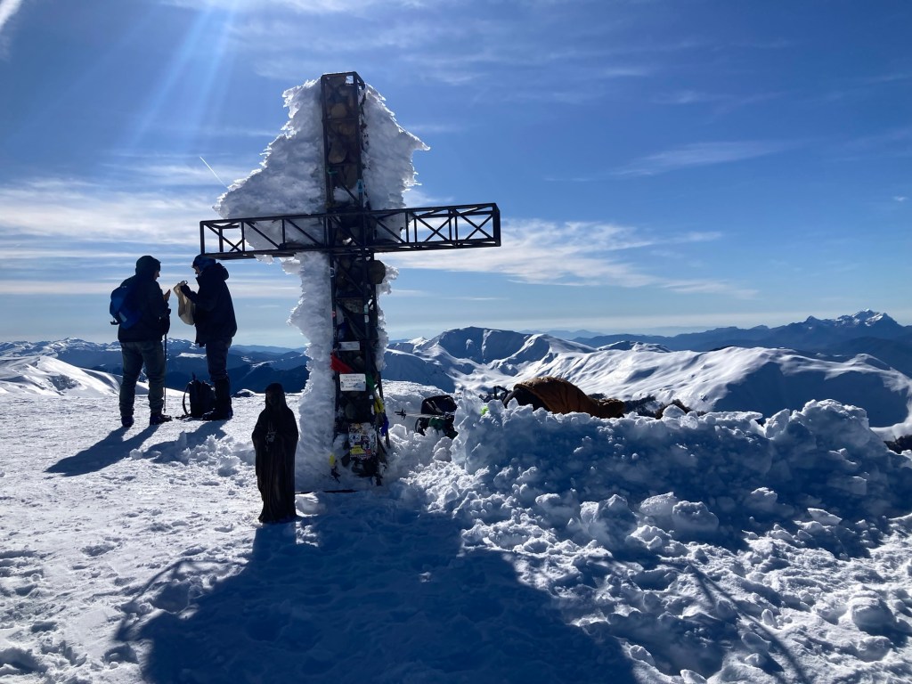 Eccomi finalmente! Vedo prima sbucare il pezzo più alto della croce, che sorge leggermente a destra rispetto al mio punto di salita. Poi ecco anche la statua della madonnina, coperta di neve fino ai piedi. Vuol dire che siamo oltre il mezzo metro anche qui, dove i venti non permettono certo accumuli importanti. Il vento…eccolo che spira sempre più forte, con raffiche che sollevano la polvere di neve a sporcare l’aria altrimenti asciutta e limpida. Alcuni ragazzi hanno scavato una buca sul fianco destra della vetta, mentre una coppia di escursionisti si aggira su quello sinistro, scrutando il serpentone bianco del crinale che si perde verso il Passone e più in là l’amato Vallestrina. Mi chiedono se conosco le vette che abbiamo di fronte “è la prima volta che veniamo qua”…li invidio quasi, vorrei quasi fosse la prima volta anche per me, anche se è sempre meraviglioso essere qua.