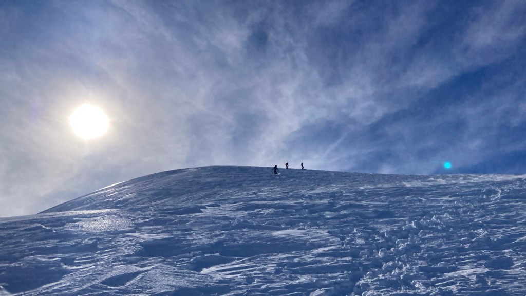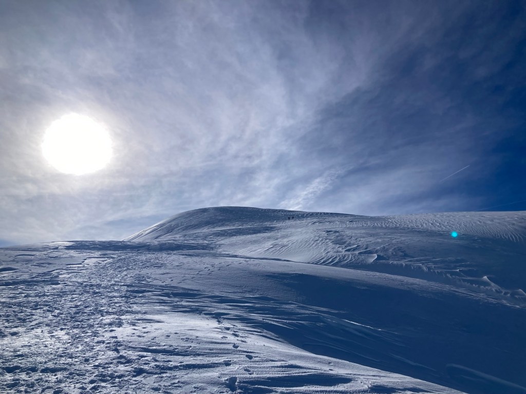 M’incanto a guardare tre sci alpinisti che dopo la fatica della salita, si godono ora la magia di quell’ampia distesa di neve in cui dev’essere un’autentica goduria poter galleggiare in scivolamento. Il primo dei tre saltella per non lasciare affondare gli sci e so benissimo che per farlo serve tanta energia. Dopo poche curve prendono la mia sinistra, per buttarsi in direzione pra-sordo. Sono di nuovo solo con la neve, la fatica e i miei pensieri, ora tutti dedicati all’arrivo. So che la vetta è proprio lì dietro la linea di demarcazione fra cielo e neve e so che non sarà una passeggiata arrivarci, per quanto ormai pare poter toccare quel confine dai riflessi a tratti violacei.