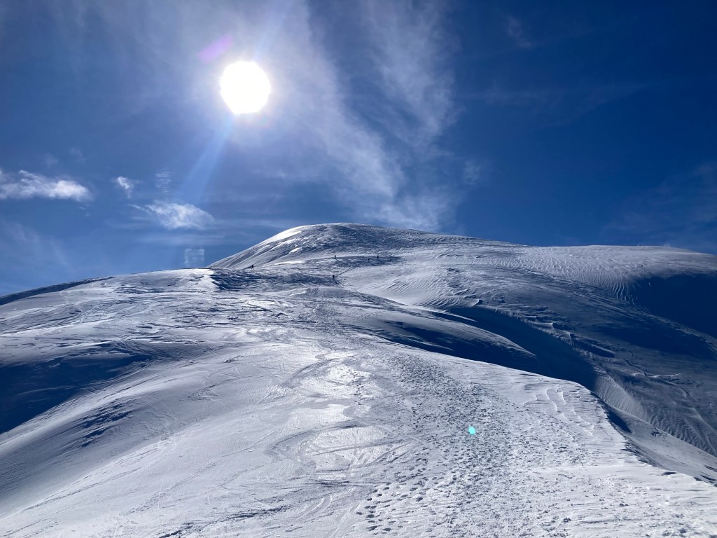Taglio un po’ verso destra, emulando idealmente quella che è la salita estiva e inizio a sentire l’arietta diventare venticello. È gelido sulla pelle, anche se proviene da sud est e fa lacrimare gli occhi sotto gli indispensabili occhiali scuri, che proteggono dal riflesso che ora è più potente, visto che il sole si è quasi completamente liberato dalla gabbia di nuvole.