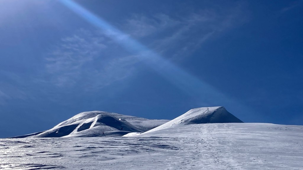Non sono nemmeno arrivato all’altezza dei primi segnavia sotto la vetta (ora completamente sepolti), che incrocio i primi escursionisti di una moltitudine che si perde all’orizzonte lungo la via sottile che ho in un paio d’ore affrontato per salire. Alla base della rampa finale incontro l’escursionista che avevo superato e filmato. È giovane, super bardato in palese difficoltà…gli chiedo se è tutto ok e lui mi dice che sì…anche se sta faticando più del previsto. Sono indeciso se consigliargli di rinunciare o se incitarlo…è quasi arrivato, c’è molta gente che eventualmente può aiutarlo: lo incito. Lui ringrazia e continua a salire. In pochi secondi siamo già distanti diverse decine di metri. La neve ora cede più che al passaggio in salita e le rampe fatte faticosamente sono infide nella discesa. C’è da fare molta attenzione.