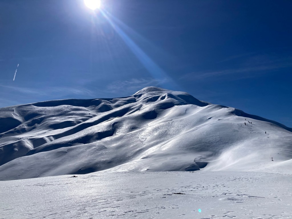 I pallini colorati che salgono si moltiplicano all’orizzonte e spiccano nel candore. Il sole è ora libero da ogni tentativo d’ostruzionismo e fa risplendere le sinuose forme della montagna. Saluto chi incontro e che mi chiede “com’è lassù?!”. Lo sanno, lo sanno, ma hanno voglia di sentirselo dire a conferma che tutta quella fatica vale assolutamente la pena. “Purtroppo c’è solo un po’ di vento” e mentre lo dico mi accorgo che ora sono troppo bardato e che inizio ad avere molto caldo. Inizio a scoprirmi e scendo rapido. Non posso non notare che molti di quelli che salgono non sono a mio avviso attrezzati a dovere…senza picozza, molti solo coi ramponcini (che diventano totalmente inutili una volta formata la soletta che li spiana totalmente)…mi faccio gli affari miei (ma a fatica), anche quando poco prima di tornare nella zona in cui riprende la vegetazione, vedo chi si approccia alla salita verso le prese con le…ciaspole…