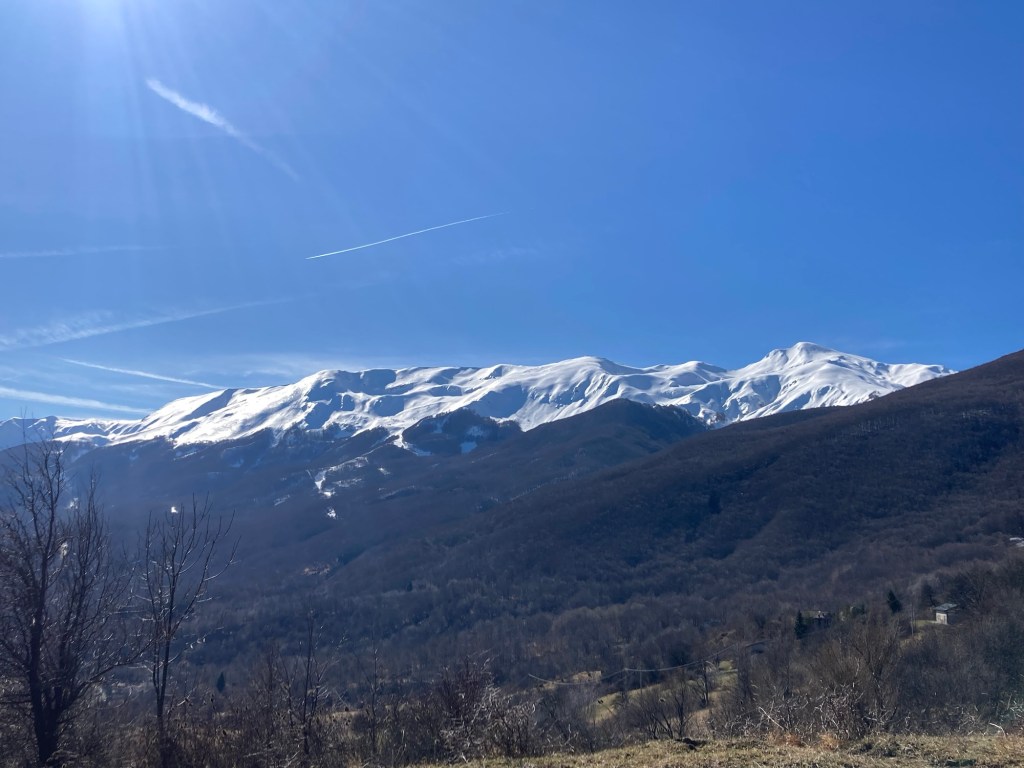 Una volta arrivato all’uscita del bosco, non posso che rimanere incantato di fronte alla meraviglia che mi si presenta: già poco prima, nella finestrella di bosco in cui credo tutti si siano fatti foto e magari qualche sogno, il Cusna appariva come una montagna di panna montata brillante sotto i raggi del sole, ora leggermente velato. In lontananza lo spigolo vivo del Cimone, girandomi di spalle la Pietra di Bismantova piantata nel bel mezzo dello spazio che divide dal Ventasso e più là, sopra il grigiore della pianura, sono ben visibili le vette alpine, che diventeranno sempre più evidenti ed inconfondibili, salendo di quota.