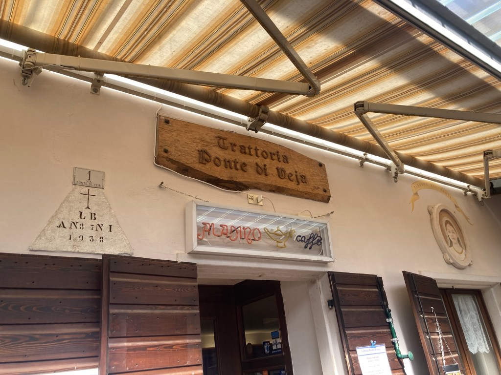 Salvo qualche piccolo e comunque misurato allungo si deve andare piano, perché le strade sono strette e piene di ciclisti che arrancano sulle salite, dove la coppia del bicilindrico Guzzi suona a meraviglia e con colpetti di gas permette di salire rapidamente, agilmente e senza sforzi. Passeggiamo e io mi riempio gli occhi del cielo che ora è azzurro brillante. Nonostante tutto l’aria rimane freschina e tiene arzilli. Percorriamo la SP33b fino a Crocetta, poi la SP34, che manterremo fino a Corrubio e da lì sempre più immersi nel verde e senza particolare traffico, eccoci alla prima sosta della giornata. Ci fermiamo nell’ampio piazzale sterrato sul lato opposto di quello antistante la Trattoria Ponte Veja a due passi dall’omonimo e celeberrimo punto escursionistico. Siamo in una conca: la strada era scesa per un po’ fin lì e poco più avanti inizia a salire, scomparendo fra le frasche ancora parzialmente spoglie della vegetazione che la fa da padrona. Da lì partono parecchi sentieri per camminate. L’immensa area ristorante all’aperto è ora deserta, ma nei giorni di calura da queste parti probabilmente il via, vai di persone dev’essere piuttosto consistente. Come da tradizione: acqua gasata e un Caffè…c’è anche chi si mangia un uovo sodo, esposto in bella vista sul bancone rustico del bar. Ripartiamo e facciamo un breve tratto di strada sempre immersi nel verde e per fortuna senza traffico veicolare, fino ad incrociare lo stesso ristorante in cui un paio di anni prima ci fermammo a rifocillarci nel giro che quel giorno si limitava alla Lessinia, regione geografica in cui ormai siamo immersi a pieno.