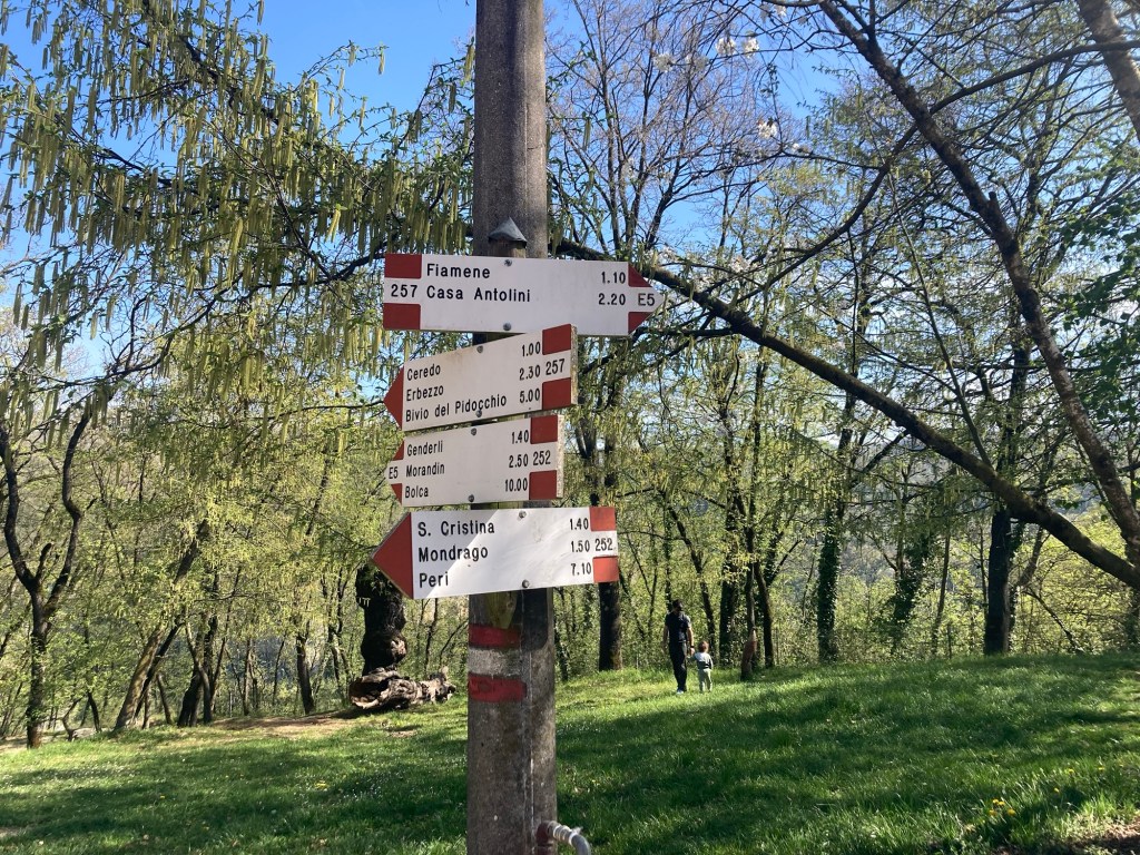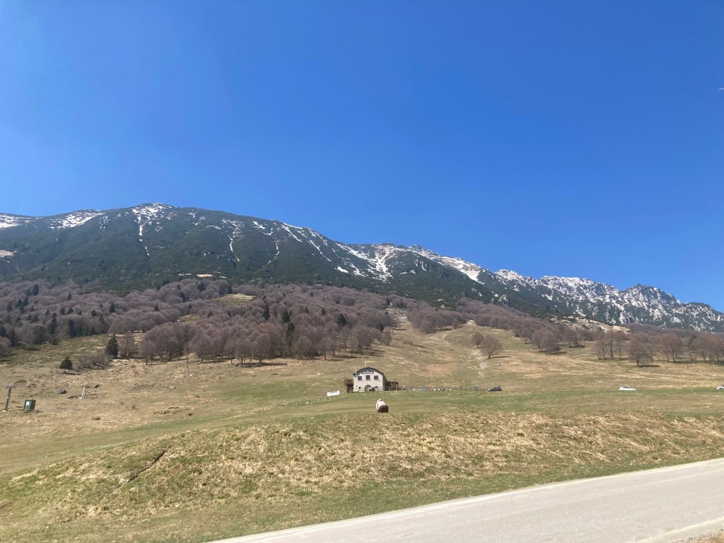 La discesa si addolcisce un po’ nel tratto finale, che coincide con l’abitato di Sdruzzinà, dove con un inversione verso sud imbocchiamo la sempre bella SS12 dell’Abetone e del Brennero, rientrando per qualche chilometro in direzione Verona. La temperatura è mite: le vigne e i frutteti che ora sono tornati grandi protagonisti, accompagnano questo rilassante tratto di strada. Il traffico è miracolosamente pochissimo e così dopo le impegnative due ore di guida su strade strette e tortuose appena concluse, ci possiamo godere a pieno le dolci ed ampie sterzate che seguono senza resistenza le collinette sovrastanti di poco il fiume Adige e la A22, che scorrono entrambi, imperterriti alla nostra destra. Vò, Masi d’Avio, Borghetto, Ossenigo e una volta a Peri, arriva anche il momento di lasciare la via curvando a destra in direzione sud-ovest, passare il fiume in località Rivalda e continuare a percorrere la via seguendo la corrente del fiume, ma sul lato opposto, lungo la SP11. Anche qui stessa situazione rilassata, con qualche moto in più e tranquilli saliscendi nell’ampia carreggiata, che continuiamo a percorrere senza fretta, godendoci il tepore e il piacere dei colori che stanno esplodendo, nonostante ci si trovi in un’area decisamente più urbanizzata. Il verde chiaro dei primi butti delle viti, lascia posto dopo poco a una vegetazione più selvatica e man, mano che si sale (ora sulla SP29a), i pascoli tornano protagonisti, mentre sulla nostra sinistra possiamo vedere più da vicino le creste montuose, ancora leggermente innevate. La temperatura torna a calare, ma il sole è un piacevole compagno, che rende brillante l’orizzonte di erba e rocce. Nelle coste all’ombra resiste anche qui qualche chiazza di neve, che ancora copre i prati. Spiazzi è l’ultimo paesone che attraversiamo nella salita all’ombra del Bondone, che rimane comunque gradevole e molto guidabile. Ancora qualche Km di curve, solo in qualche raro caso impegnative, poi arriviamo nell’ampio parcheggio dello Chalet Novezza: sono circa le 13 e lo stomaco reclama attenzione; è decisamente venuto il momento di concederci una pausa.