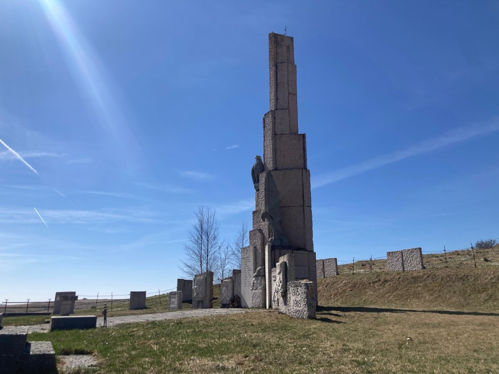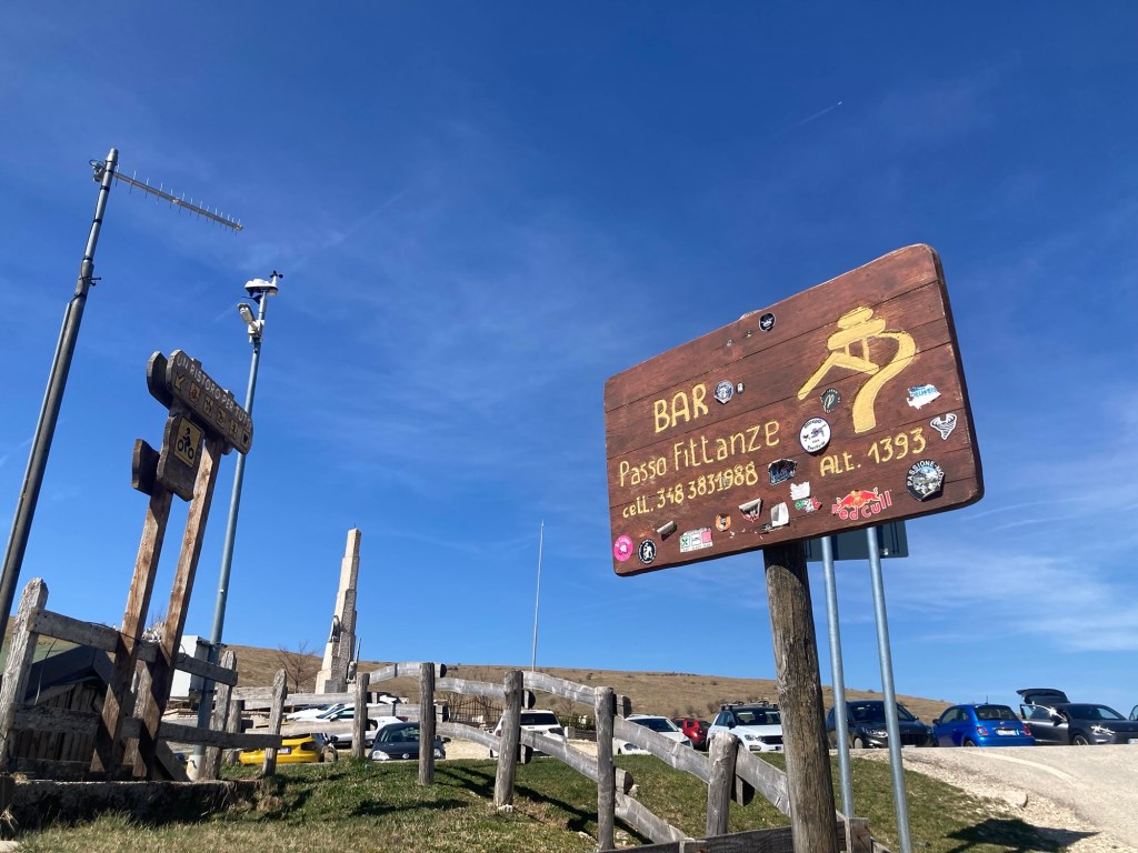 Dai vigneti ai boschi, ora dai boschi alle praterie. Addirittura qualche chiazza di neve che resiste nelle zone più in ombra. Tante moto che si godono, come noi, lo spettacolo di queste terre a poco meno di 1400 Mslm, dove il verde è spezzato solo da qualche costruzione rustica e dalle figure paciose delle vacche al pascolo. L’aria torna ad essere bella frizzantina, nonostante il sole ora brilli senza ostacoli ed eccoci fermi a fianco di un monumento ai Caduti delle due guerre mondiali a fianco del ristoro di Passo Fittanze. Qui conosciamo il possessore di una Guzzi California del 1993 (ci dirà dopo): bellissima e tirata a spigolo vivo. Lo avevamo superato pochi chilometri prima nella curve dolci, ma dal fondo un po’ viscido, che ci aveva suggerito pieghe più misurate del solito e andature guardinghe.