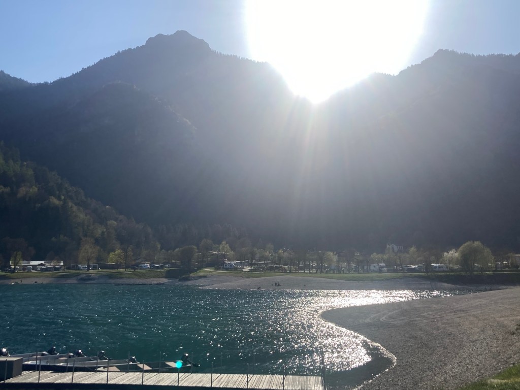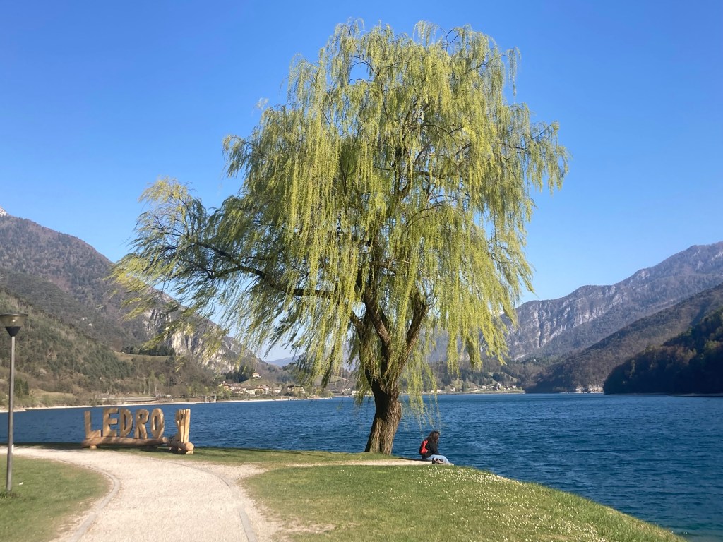 Mancano pochi minuti alle 17 e invece che il te, ci tuffiamo sulla tanto agognata fetta di strudel e perché no, due birrette piccole; ce le fanno pagare care, ma la vista lago, il simpatico accento argentino dei gestori (sì argentini in Trentino) e il riposo, fanno passare in secondo piano questo antipatico dettaglio. Il sole intanto si è abbassato parecchio e inizia a sfiorare le cime della cresta che chiude il panorama ad Ovest. La brezza invece si trasforma a tratti in fastidiose sventagliate fredde. Un salice meraviglioso fa da guardiano allo specchio d’acqua turchese e intorno a noi la pace è rotta solo dai giochi di qualche bambino nel vicino parchetto attrezzato. Non c’è quasi nessuno in giro e il tutto rende questa pausa davvero ristoratrice.